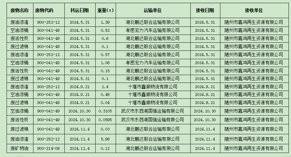 湖北三環(huán)鑄造股份有限公司 2024年度危險(xiǎn)廢物污染環(huán)境防治信息公示 根據(jù)相關(guān)法律法規(guī)和上級(jí)管理部門的要求,產(chǎn)廢單位需每年將本單位危險(xiǎn)廢物污染環(huán)境防治信息進(jìn)行公示,現(xiàn)將湖北三環(huán)鑄造股份有限公司2024年度危險(xiǎn)廢物污染環(huán)境防治信息公示如下: